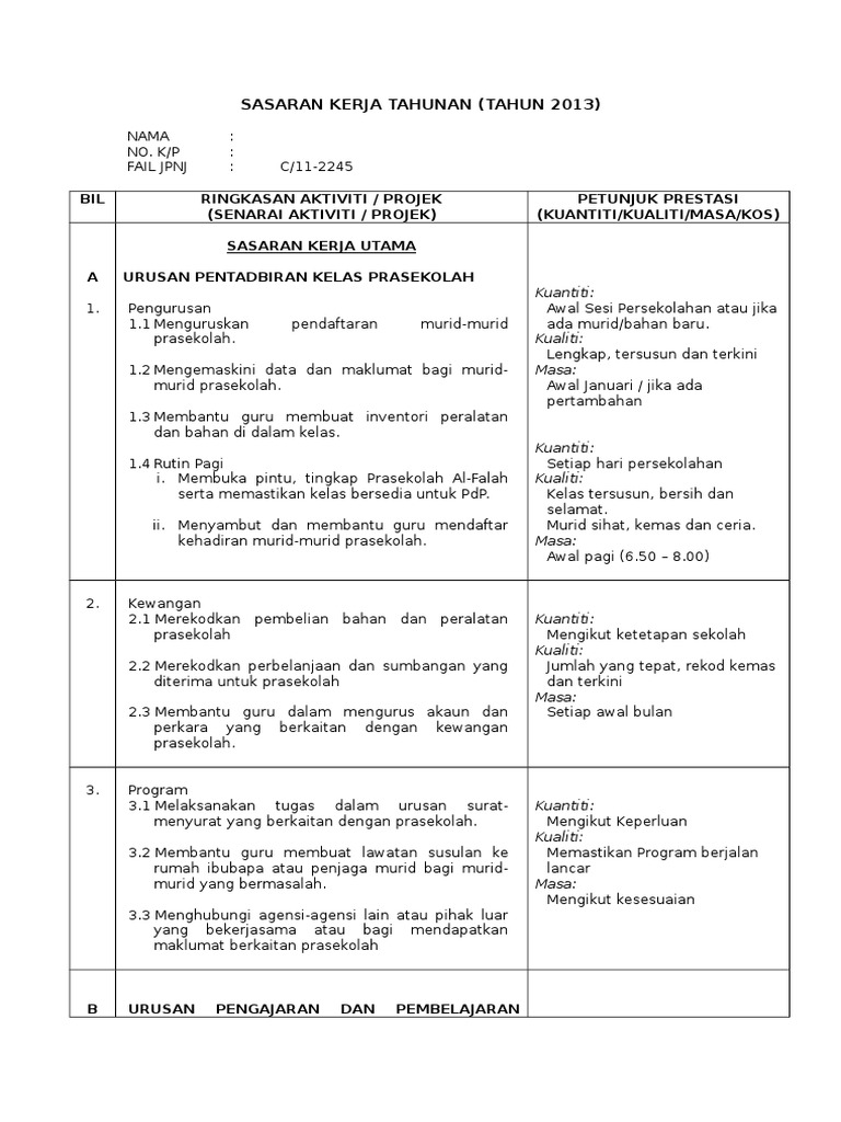 Berikut merupakan contoh Sasaran Kerja Tahunan Prasekolah. Penyediaan SKT yang teratur membolehkan penilaian prestasi. Konten blog dimigrasikan ke SKPedia.